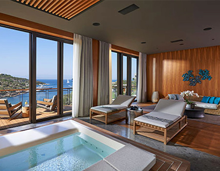Situated in Bodrum, Göltürkbükü, Mandarin Oriental, standing out in the luxurious hotel category in Turkey, is home to spa and wellness services blended with the Aegean concept. It has a rich spa menu that includes; various traditional hammam experiences, signature therapy rituals, calming and relaxing massage services, peeling and Wrap treatments, specially designed treatments for those who travel and for men, meditation sessions, yoga, Pilates and personal exercise programs. Mandarin Oriental Bodrum stands out with its pleasant, comprehensive and naturally beautiful construction. The SPA is one of the best spa areas in Turkey, with 6 different treatment rooms and 3 beautician rooms, open-air spa cabins with a sea view, a wide variety of warmth and water possibilities, saunas and steam rooms, a fully equipped gym, Kinesis fitness Wall, SUP and open-close swimming pools.